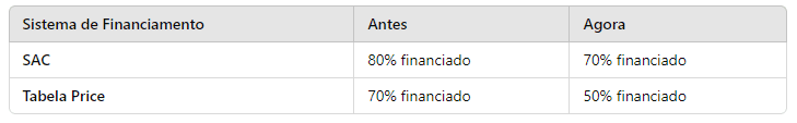 As mudanças mais relevantes anunciadas pela Caixa Econômica Federal estão diretamente relacionadas ao percentual de financiamento. Antes, os compradores podiam financiar até 80% do valor do imóvel pelo Sistema de Amortização Constante (SAC) e até 70% pela Tabela Price. No entanto, com as novas regras, esses percentuais foram reduzidos para 70% e 50%, respectivamente​.